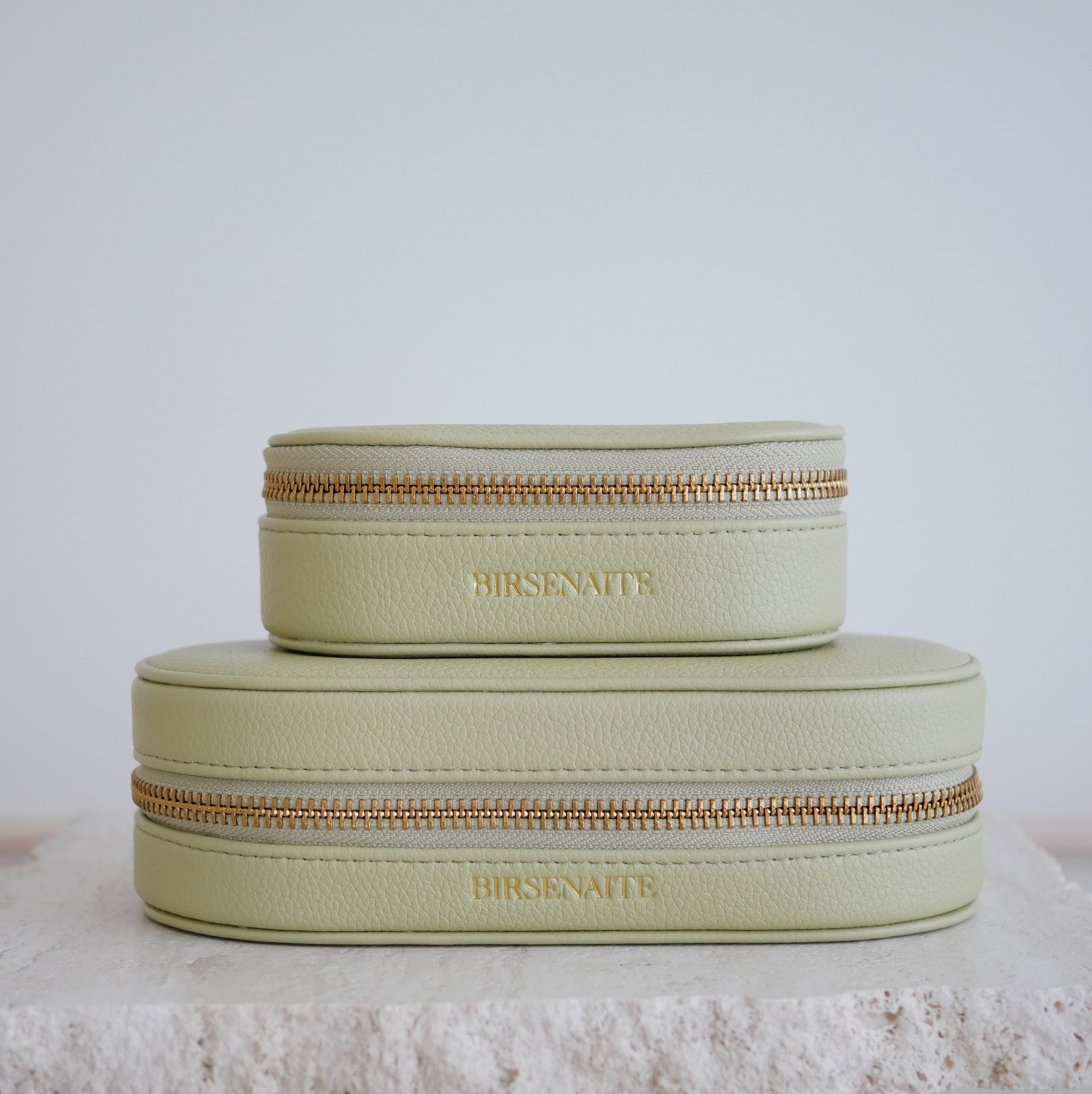 I designed this larger jewellery case for those who love to keep their treasures beautifully organised. With more space for rings, hoops, necklaces and other pieces, it’s ideal both for home and travel. The oval zip-around form feels timeless and elegant, while the soft interior and signature Birsenaite logo add a touch of quiet luxury to your everyday rituals.