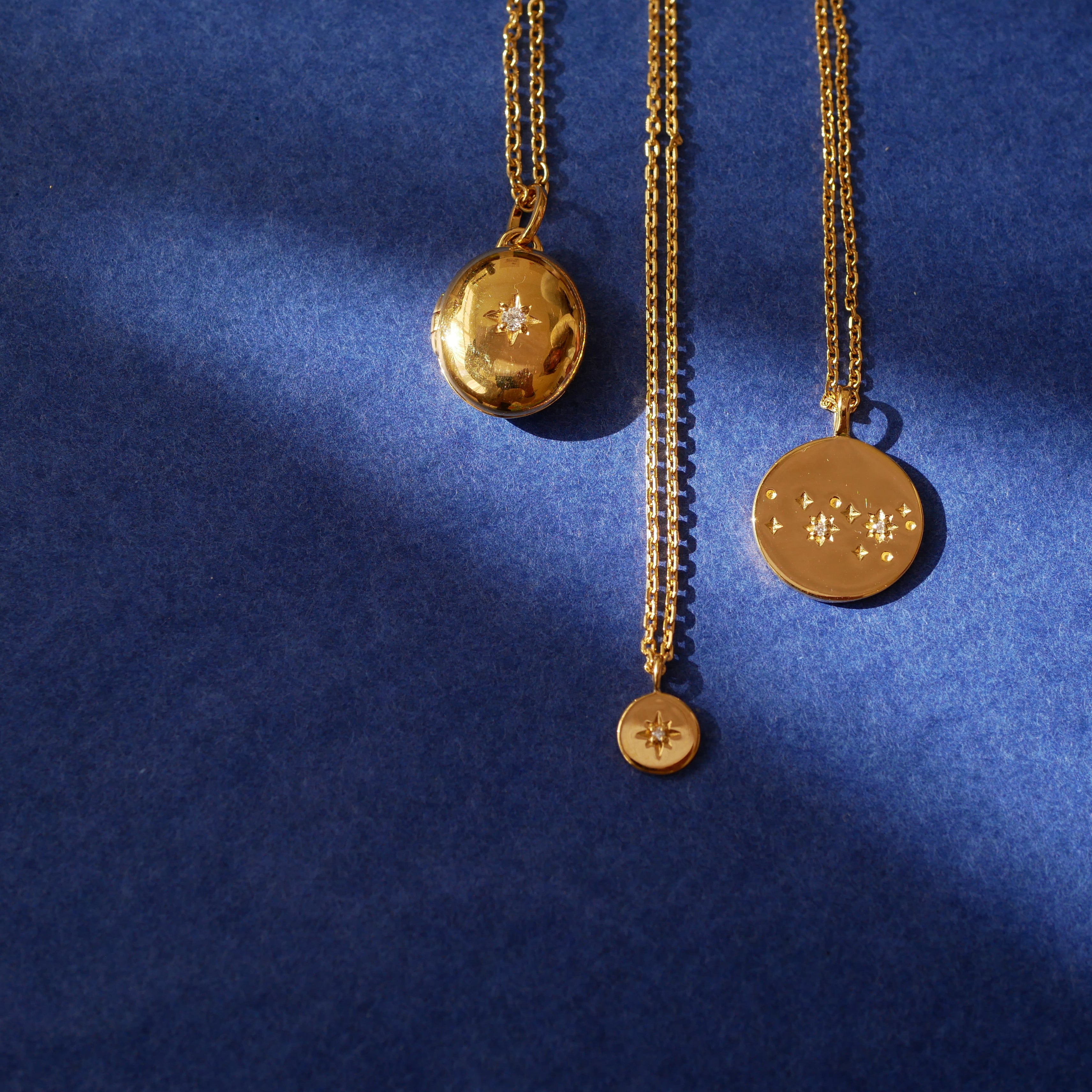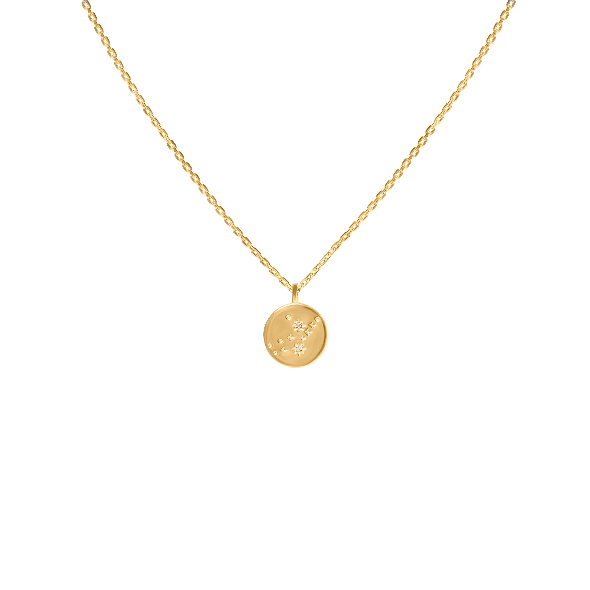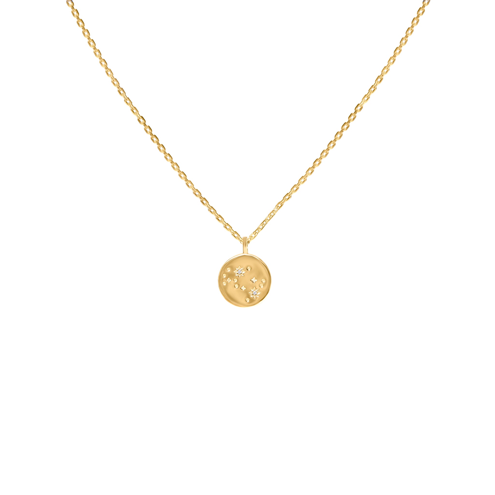I shaped these pendants after the zodiac constellations, mapping the night sky into gold. Tiny diamonds become the stars — glowing softly as a reminder that our stories are written above us. Wear it close to your heart as your own guiding light, both delicate and eternal.