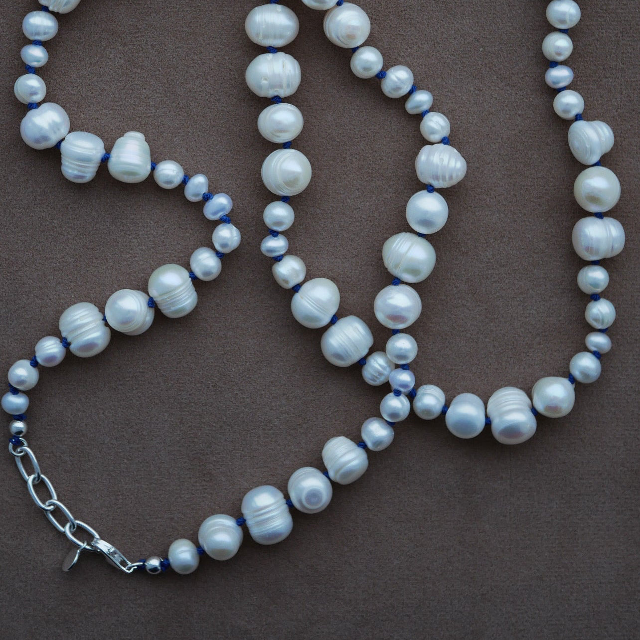 I’ve always loved pearls that feel a little undone. These are hand-knotted on deep navy silk — a subtle detail that gives them depth and modernity.
